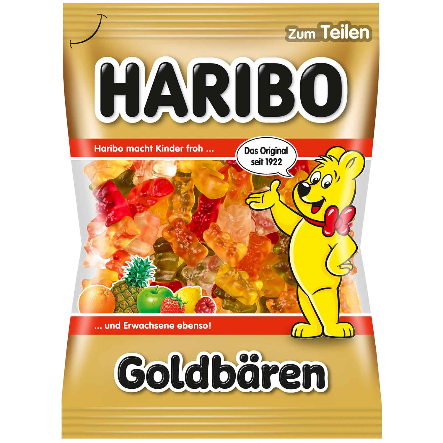 Unsere Nummer 1 im Süßwarenregal! Generationen lieben sie und sind mit ihnen groß geworden. Die HARIBO Goldbären sind seit über 90 Jahren unser Erfolgsprodukt in den lecker-fruchtigen Geschmacksrichtungen Ananas, Apfel, Erdbeere, Himbeere, Saftorange und Zitrone. Im klassischen 200 g-Beutel eignen sich die Goldbären perfekt zum Naschen mit Euren Liebsten.