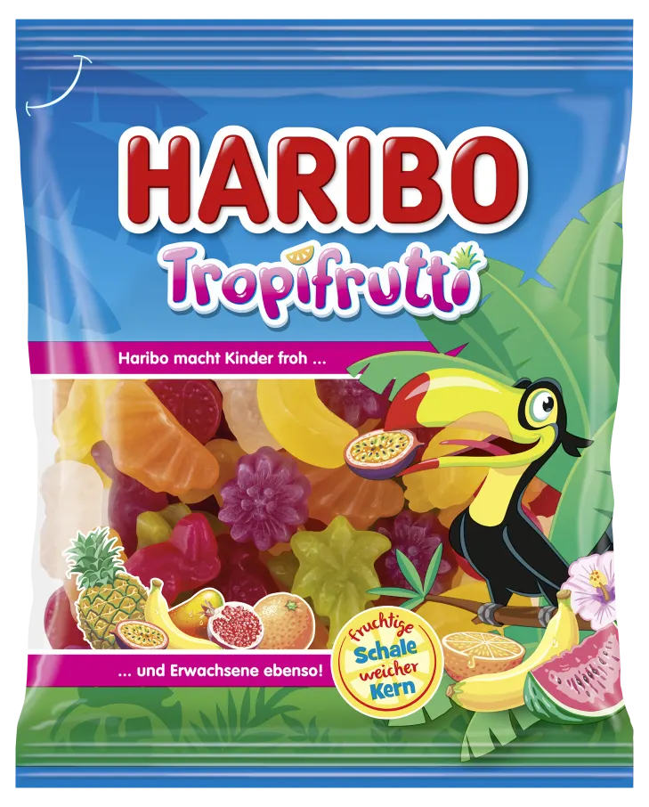 HARIBO Tropifrutti macht das Leben einfach tropischer! Ob als Tukan, Palme, Maracujablüte, Banane, Mango-Mandarine, Cassis oder Ananas - HARIBO Tropifrutti ist ein einzigartig fruchtiges Naschvergnügen!