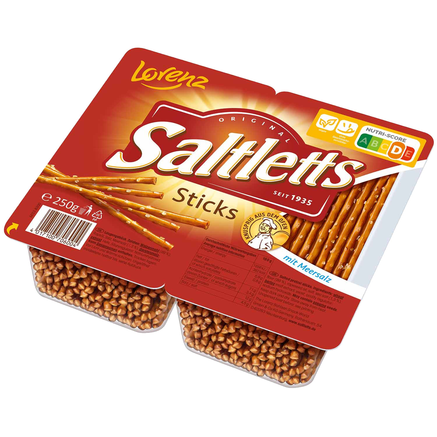 Ein beliebter Knabberartikel: Saltletts von Lorenz® sind leckere Salzstangen, die Sie in der praktischen Doppelpackung erhalten. Das Laugengebäck wird mit echtem Meersalz verfeinert, der knusprig-salzige Geschmack ist unverwechselbar.